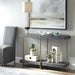Contemporary In Style, This Console Table Features A Stainless Steel Framework Finished In A Brushed Brass With A Starburst Acacia Veneer Top In A Dark Walnut Stain Washed With A Light Gray Glaze.
