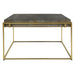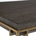 A Contemporary Combination Featuring An Acacia Veneer Top In A Dark Walnut Stain Washed With A Light Gray Glaze, Suspended In A Stainless Steel Framework Plated In Brushed Brass.