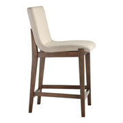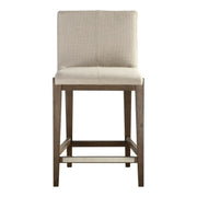 Gently Sloped Padded Seat In A Beige Linen Blend Performance Fabric Rests Within A Solid Birch Wood Frame Finished In Light Walnut, With A Brushed Nickel Metal Kick Plate.