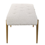 Expertly Tailored In White Faux Shearling, This Glamorous Accent Bench Features A Plush Button Tufted Seat, Atop Four Tapered Stainless Steel Legs Finished In Antique Brushed Brass.