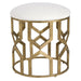 Stylish And Versatile, This Round Accent Stool Showcases A Solid Iron Base With A Modern Geometric Motif Finished In Antique Brushed Brass. The Cushioned Top Is Upholstered In A Crisp White Textured Fabric, Doubling Its Use As A Seat Or Footrest.