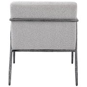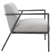 With Clean Contemporary Lines, This Open Frame Design Features A Textured Cast Iron Frame In A Natural Distressed Charcoal Finish. Paired With A Tight Upholstered Seat In A Casual Ivory And Light Gray Boucle Fabric.