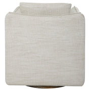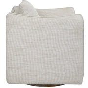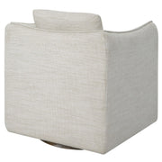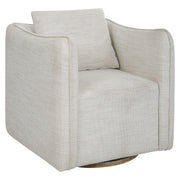 Casual Shelter Arm Accent Chair Tailored In A Woven Linen Blend Fabric In Off-white, Featuring A Flanged Edge Trim Complete With A Loose Back Pillow. Rests On A Solid Birch Wood Swivel Base, Finished In A Weathered Gray Stain.