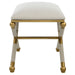 With Classic Simplicity, This Small Bench Features A Smooth Iron Base Finished In An Elegant Gold Leaf With Braided White Rope Detailing, Upholstered In A Crisp Textured White Polyester Fabric.