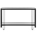An Elegant Silhouette Console Table With Simple Clean Cut Lines And Enriched With Added Curves. Featuring A Satin Black Iron Frame With A Top And Gallery Shelf In Clear Glass.