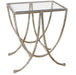 Gracefully Curved In Hand Forged Iron And Finished In Antiqued Silver Leaf. Top Is Clear Tempered Glass. Matching Coffee Table Is #24593.