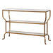 Elegantly Curved Frame Accentuates The Graduated Top Of This Console In Hand Forged Iron With An Antiqued Gold Finish. Shelves Are Clear Tempered Glass.