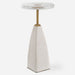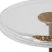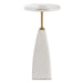 The Sora Drink Table Features A Thick Seeded Glass Top With A Complimenting White Sandstone Base And Brushed Brass Stainless Steel Accents.