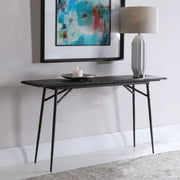 Showcasing A Modern Industrial Look, This Console Features Naturally Textured Black Slate With Organic Broken Edges. Rests On An Iron Trestle Base With Chiseled Details Finished In Aged Black. Each Top Will Have Naturally Occurring Color Variations Such As Mottling As Well As Naturally Formed Vein Lines, Making Each Piece Unique.