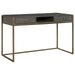 Contemporary In Style, This Writing Desk Features A Sleek Stainless Steel Framework In Plated Brushed Brass. The Top Is Crafted From Acacia Veneer In A Dark Walnut Stain And Light Gray Glaze With Brass Drawer Pulls.