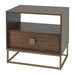 Versatile Function With Modern Styling, Fully Finished In A Dark Walnut Over Walnut Veneer. Features An Open Pass-through For Decorative Storage And A Pull-out Drawer With An Embossed Metal Pull Finished In Antique Brass, Set Atop A Brushed Brass Open Framed Iron Base.