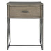 Showcasing A Blend Of Tonal Mixed Media Elements, This Side Table Is Wrapped In A Soft Mushroom Gray Oak Veneer With A Brushed Pewter X Base, And Topped With An Aged Gray Concrete Slab. Has One Storage Drawer With Coordinating Brushed Pewter Bar Hardware.