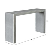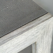 With Modern Elements, This Transitional Console Features Stitched Panels Of Light Gray Faux Shagreen, Paired With A Contrasting Wood Finish In A Aged White With Gray Distressed Details.