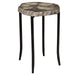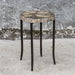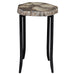 This Rustic Modern Accent Table Features A Suar Wood Cross-cut Section With Natural Live Edge Details And A Rich Petrified Finish, On Tapered Metal Legs Finished In Aged Iron.