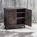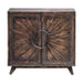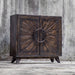 Featuring A Glowing Hand Rubbed Finish Of Worn Black With Honey Undertones And Gray Glazing Over Mango Veneer, This Two Door Cabinet Is Accented With Curved Sunburst Inlay Doors. Iron Ring Hardware In Dark Bronze Reveals Four Adjustable Shelves.