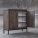 Soft Contemporary Styling, Featuring A Paris Silver Finish, A Subtle Metallic Silver Over A Light Walnut Stain, Set Atop A Simplistic Iron Base Finished In Aged Steel With Coordinating Door Pulls. Has Two Adjustable Shelves.
