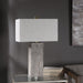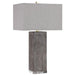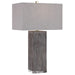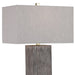 Contemporary In Design, This Table Lamp Is Finished In A Rustic Wood Look With Tones Of Light Gray, Dark Gray And Aged Brown. A Thick Crystal Foot And Antiqued Brushed Brass Hardware Complement The Piece. A Light Gray Linen, Rectangle Hardback Shade Completes This Design.