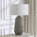 Showcasing A Classic Carved Herringbone Pattern, This Ceramic Table Lamp Is Finished In A Versatile Soft Gray Glaze With Brushed Nickel Accents. A White Fabric Drum Shade Completes The Look.