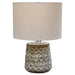 A Transitional Take On An Old-world Look, This Ceramic Table Lamp Features A Heavily Distressed Blue-gray Crackle Glaze With Intricate Embossed Geometric Details, Accented With Brushed Nickel Details And A Thick Crystal Collar. A Light Gray Linen Fabric Shade Completes The Look.
