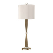 This Sleek Design Features Tapered Steel Columns, Finished In Plated, Lightly Antiqued Brushed Brass, Accented With Thick Crystal Details. The Square Hardback Shade Is A White Linen Fabric With Rolled Edges.