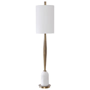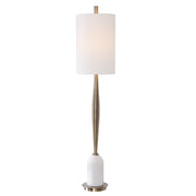 Transitional In Design, This Buffet Lamp Has A Tapered Base Finished In A Plated Antique Brass, Accented With A Polished White Marble Detail. This Piece Has A White Linen Hardback Drum Shade.