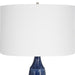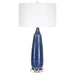 Finished In A Distressed Deep Cobalt Blue Glaze With Subtle White Undertones, This Table Lamp Features A Textured Ceramic Base With Iron Details Finished In Brushed Nickel Displayed On An Elegant Crystal Foot. The Lamp Is Complimented By A White Linen Drum Shade.