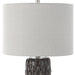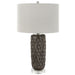 This Ceramic Table Lamp Features A Deep Mushroom Gray Glaze Over Carved Details, Accented With Polished Nickel Plated Details And An Elegant Crystal Foot. The Lamp Is Paired With A Hardback Drum Shade In Light Gray.