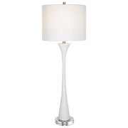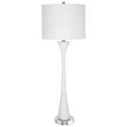 Showcasing A Classic Trumpet Shape, This Buffet Lamp Is Handcrafted From Ivory Man-made Stone That Accurately Replicates The Look Of Thassos Marble, Displayed On A Thick Crystal Foot, Paired With Brushed Nickel Plated Accents. A White Fabric Shade Completes The Piece.
