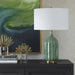 Crafted With A Ceramic Base Featuring Scalloped Channels And An Organic Striped Texture, All Bathed In A Luxurious Hunter Green Glaze. Enhanced With Plated Antique Brass Finishes. The Round Drum Shade Is Covered In A Crisp White Linen Fabric.