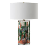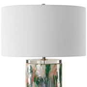 This Unique Ceramic Lamp Is Finished Like An Abstract Piece Of Art Featuring Shades Of Luscious Green, Hints Of Blues, Pops Of Salmon On A Off White Background, Paired With Thick Crystal Details And Plated Brass Accents. A Round Drum Shade Covered In A Crisp White Linen Fabric Completes The Piece. Due To The Nature Of Fired Glazes On Ceramic Lamps, Finishes Will Vary Slightly.