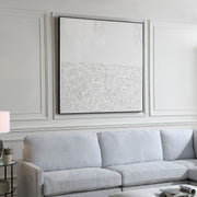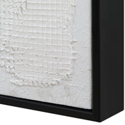 Below The Surface Hand Painted Canvas Speaks Volumes With Its All-white Palette And Intriguing Heavy Texture. A Slim, Black Gallery Frame Completes The Artwork. Due To The Handcrafted Nature Of This Artwork, Each Piece May Have Subtle Differences.