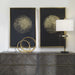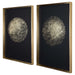 This Striking Artwork Features Hand Applied Gold Foil Spheres Set Against A Black Background. Each Sophisticated Piece Is Accented By A Simple Brushed Gold Plated Stainless Steel Frame And Is Placed Under Glass. Artwork By Renee W. Stramel.