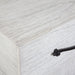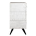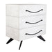 The Vivi Three Drawer Chest Features A White Finish With Black Iron Accents. Displaying Alternating Mindi Veneer Directions Giving It A Playful Element, While The Wide Black Hardware And Matching Legs Add To Its Contemporary Look. Has Soft Closing Drawer Glides.
