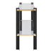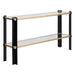 Contemporary Console Table Composed Of Stylish Iron Legs Finished In A Two-toned Matte Black And Gold Leaf. The Table Also Features Both A Top And Gallery Shelf Made Of Tempered Clear Glass Providing Ample Shelf Space And Elegance.
