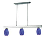 Straight line and rectangular detailing defines the bold and contemporary look of this three light fixture. Circular blue glass shades provide a splash of color, and telescoping rods ensure a perfect hanging height. This fixture would be the perfect addition to a kitchen, a game room, or anywhere else in the home.