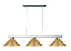 Straight line inspired detailing defines this beautiful three light fixture. Finished in brushed nickel and paired with metal satin gold shades, this three light fixture would be equally at home in the game room, or anywhere else in the house needing a touch of modern charm. Adjustable rods are included to ensure the perfect hanging height.
