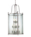 With traditional styling and modern application this twelve light chandelier is as versatile as it is stunning. Glass panels form the circular cage that is suspended from swooping arms, which are finished in brushed nickel.