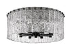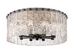 Adding a compelling mix of artistry and natural elements to the mix, this round flush mount ceiling light captures the imagination. The Glacier round eight-light flush mount ceiling light offers a decadent look of individual clear textured glass panels that emulate melting ice, an extraordinary effect with dramatic impact in a foyer, kitchen, or main living area. Matte black finish steel is placed as a crown frame, adding a contrast in both style and finish and embellishing the optical delight accomplished when the fixture is illuminated.