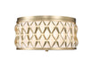 Sculptural transitional artisan flavor is perfect for any setting as this modern gold finish steel four-light flush mount ceiling light captures deserved attention. Living rooms, dining spaces, and foyers receive a timeless style motif with a drum-shaped fixture featuring symmetrical ribbon waves cascading vertically, banded on both edges. A white diffuser filters glowing light, creating superb optical ergonomics.