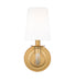 Cool glass and a rubbed brass finish create the perfect combination for this modern one-light wall sconce. Its round wall plate pairs with a slim glass arm, lending exceptional delicacy and classical ambiance. On top, a tapering shade in white fabric casts glowing, rich light, perfect for living areas and bedrooms, alike.