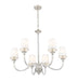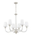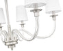 Pre-war decorative elegance infuses this modern six-light chandelier. Slender glass arms pair with a steel frame and brushed nickel finish, ensuring a rich, refined look and feel. The fixture is complete with tapering white fabric shades, offering the perfect ambiance for every occasion.