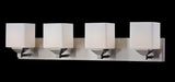 Rectangular shaped hardware and complimenting cube shades create a straight contemporary look. This four light vanity is finished in brushed nickel, and includes matte opal shades. This fixture will add a touch of contemporary to any décor.