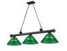 With a dramatic, matte black finish frame and three green acrylic shades, this traditional metal billiard light adds a colorful, modern edge to classic interior décor. Place it over a pool table or in a dining room for inviting ambiance that elevates any home.