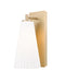 Illuminate a bedroom or living area with the sophisticated presence of a modern one-light wall sconce from the Farrell collection. Its elongated profile extends to both its modern gold finish wall plate and fluted glass shade, creating a striking blend of refinement and character.