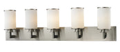 The contemporary Savannah family adds sophistication to home décor. The beautifully appointed brushed nickel fixture is perfectly paired with matte opal glass shades in this 5 light vanity.