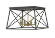 Indulge in an exercise of geometrics and stunning interior décor, adding this four-light flush mount ceiling light to a main living space. With an angular, open-concept cage frame made from Matte Black finish metal, its charming Old Brass finish candelabra bulb base offers a delightful contrast.