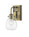 Classic transitional fare helps illuminate a custom space as it adds a sleek, sophisticated vibe. This matte black and olde brass finish wall sconce offers a clear linear silhouette with a romantic round clear glass shade.