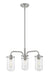 Edgy design meets softened industrial personality in a light fixture that turns heads. Make this brushed nickel and glass three-light chandelier a focal point in a custom transitional space.