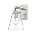 Contemporary bathrooms light up with the chic, delicate design of this one-light wall sconce. With a conical shade crafted of clear glass, it adds a charming motif with a brushed nickel finish hand-tooled steel mount adding festive geometric accents. This light from the Harper collection dazzles in a custom bath space.