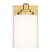 Blending traditionally clean lines with a glowing, warm palette, this one-light wall sconce creates a sophisticated dose of simplicity. The Soledad collection offers this fixture with a minimalist silhouette with brushed gold finish steel serving as a rectangular wall plate and holder, and a chic cylinder shade made of delicate white glass. This fixture may be mounted facing up or down in an en suite or guest bathroom or hallway.